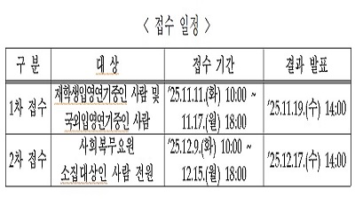 서울지방병무청은 11월 11일(화)부터 2026년 사회복무요원 소집 접수를 시작한다고 밝혔다. 1차 접수는 재학생 입영 연기자와 국외 입영 연기자를 대상으로, 2차 접수는 12월 9일(화)부터 사회복무요원 소집 대상자 전원을 대상으로 진행한다. 소집 신청은 병무청 누 2025-11-05 11:19:02