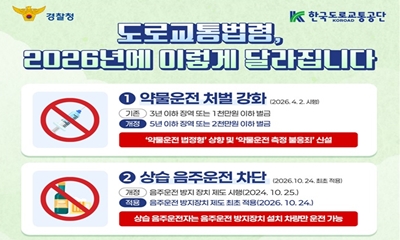 2026년 4월 2일부터 약물 운전 법정형이 상향되고 약물 운전 측정 불응죄가 신설되는 등 약물 운전 처벌이 강화된다. 기존 3년 이하 징역 또는 1천만원 이하 벌금이, 5년 이하 징역 또는 2천만원 이하 벌금으로 강화됐다. 또 2026년 4월부터 상습 음주 운전 차단을 2025-12-31 17:02:14