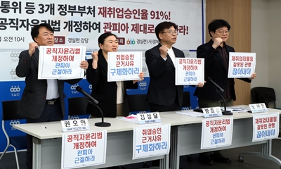 경실련은 4월 16일 경실련 강당에서 기자회견을 열고 과기부·방통위·미래부 등 3개 정부 부처 ‘관피아’ 실태조사 결과를 발표했다. 이날 발표한 실태조사 결과에 따르면 3개 정부 부처 재취업 승인율은 과학기술정보통신부(93.0%), 방송미디어통신위원회(구 방송 2026-04-16 16:03:36