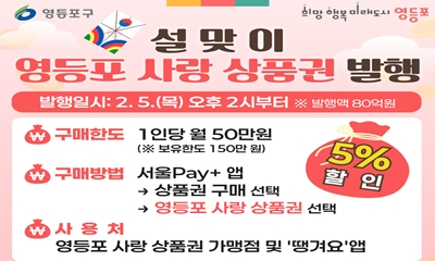 영등포구가 2월 5일 오후 2시부터 총 80억 원 규모의 ‘영등포 사랑상품권’을 발행한다. 새해 들어 처음으로 발행하는 영등포 사랑상품권은 ‘서울페이 플러스(서울PAY+)’ 앱을 통해 5% 할인된 금액으로 구매할 수 있다. 스마트폰에 앱을 설치한 뒤 본인 인증과 계좌 2026-02-03 10:21:07