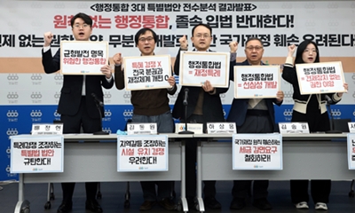 경실련은 2월 10일 경실련 강당에서 기자회견을 열고 “행정통합 3대 특별법안 전수 분석 결과발표와 졸속 입법 중단을” 촉구했다. 경실련은 “행정통합, 지역 균형발전인가? 특혜 쟁탈전인가?”라고 묻고 “3대 특별법안 전수분석 결과, 조문의 84%가 대규모 개발, 2026-02-10 16:26:10