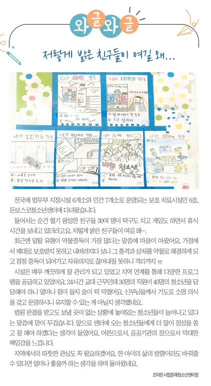 전국에 법무부 지정시설 6개소와 민간 7개소로 운영되는 보호 치료시설인 6호, 돈보스코청소년센터에 다녀왔습니다.