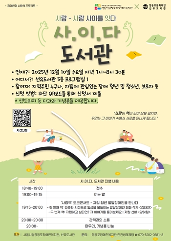서울 시립 영등포장애인복지관(관장 최종환)은 선유도서관과 공동으로 12월 10일(수) 오후 7시에 개최하는 이번 프로젝트는 두 기관이 협력해 운영하는 주민 참여형 장애 인권 프로그램이다. 장애·비장애 주민이 서로의 삶을 직접 듣고 이야기하며 지역사회 안에서 인권 감수성과 상호 이해를 확장하는 것을 목표로 한다. 이번 프로그램은 장애·비장애 주민이 서로의 삶을 직접 듣고 이야기하며 지역사회 안에서 인권 감수성과 상호 이해를 확장하는 것을 목표로 발달장애 회화 작가 김대연, 자립생활을 실천하고 있는 인권 강사 강하림이 참여한다. 서울 시립 영등포장애인복지관에 따르면 김대연 작가는 디지털 드로잉 창작 활동을 통해 본인의 생각과 감정을 표현해 온 과정과 예술 활동의 의미를 나누고, 강하림 님은 그룹홈 생활, 자립 준비 과정, 인권 강사 경험 등 실제 삶을 중심으로 이야기를 들려준다. 두 기관은 이번 협업을 통해 지역 도서관을 기반으로 한 주민 참여형 인권 교육 모델을 확장하고자 한다. 행사는 ▲사이다 도서관 소개 ▲사람책 토크콘서트 ‘자립 청년 발달장애인을 만나다’ ▲관객과의 소통 ▲기념품 나눔 등으로 구성되며, 지역 주민 누구나 참여할 수 있다. 영등포장애인복지관 최종환 관장은 “지역 도서관과 함께 만드는 사람 책 프로젝트는 주민들이 일상에서 인권을 접할 수 있는 새로운 방식이다”라며 “두 기관의 협력이 지역사회 인권 문화 확산으로 이어지길 기대한다”라고 밝혔다.