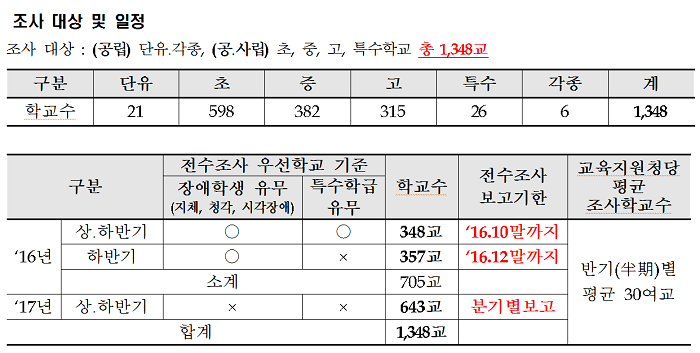 조사는 교육지원청별 전수조사 담당자(청별 2인, 총 22인)가 직접 학교를 방문하여 모든 건축물을 대상으로 진행한다. 이들은 전수조사표에 따라 매개시설, 내부시설, 위생시설, 안내시설 등 모든 장애인 편의시설 설치 여부를 확인할 예정이다. 이를 위해 서울시교육청은 오는 17일~18일 전농중과 강신초에서 전수조사 담당자 교육 및 시범조사를 시행한다. 이날 시범조사에서는 우창윤 서울시의회 의원과 BF(Barrier Free, 장애물 없는 생활환경) 인증기관인 한국장애인개발원의 협조를 받아, 전수조사 담당자가 직접 휠체어를 체험하며 장애인의 시선으로 전수조사 함으로써 조사의 일관성 및 신뢰성을 확보한다는 방침이다. 서울시교육청은 지역교육청별 2명의 조사 인원을 고정 편성, 대상학교 조사 우선순위(장애 학생 유무 > 특수학급 유무)에 따라 전수조사 실시한 후 조사결과를 토대로 ▲예산의 합리적인 단계별 운용 방안 ▲장애학생을 위한 정보 제공 및 알 권리 확보 방안 ▲배정업무의 효율화 등 장애인 편의시설의 효율적·체계적 관리 및 정책수립을 위한 기초 자료로 활용할 계획이다. 우창윤 시의원은 “장애인 등이 학교 밖에서뿐만 아니라 학교 안에서도 동등한 교육의 기회를 받기 위해 학교는 장애인 편의시설을 기준에 맞게 설치해야 한다”고 강조했다.