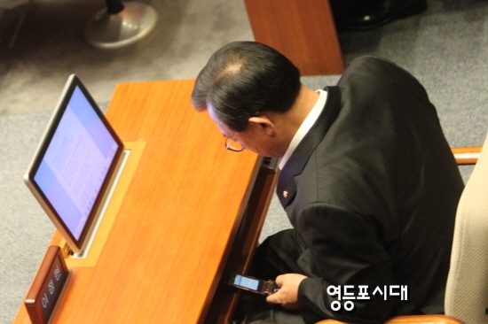 이날 추미애 대표의 교섭단체 연설이 진행되는 동안 새누리당 의원들은 제각각의 모습으로 본회장을 지켰으며 야유는 없었다.