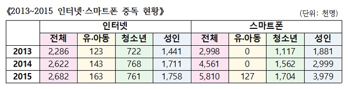 지난해 인터넷·스마트폰 중독자 849만 명 추정 지난 3년간(2013~2015) 인터넷 중독자는 230만 명에서 270만 명으로 소폭 증가했지만 스마트폰 중독자는 300만 명에서 580만 명으로 2배 가까이 증가한 것으로 나타났다.