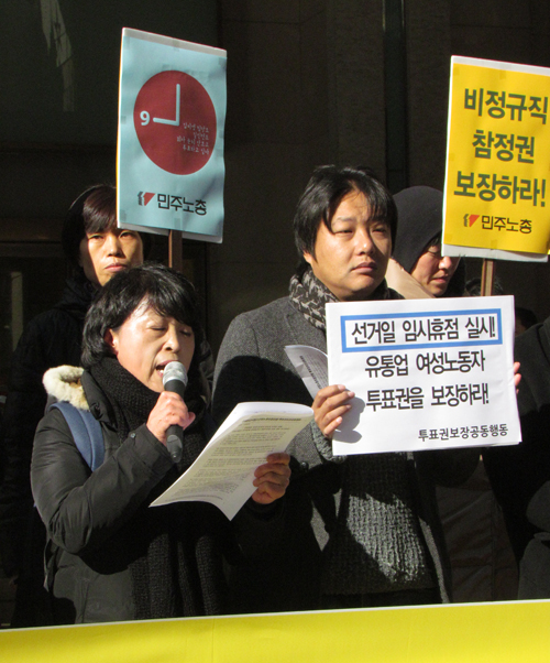 유통업종 종사자들, “국민이 가질 수 있는 권리를 우리도 행사 하고 싶다” 백화점, 면세점, 할인점 등 유통업 여성노동자들의 투표권 행사가 현실적으로 어려운 상황 속에 오는 19일 대통령 선거(서울 교육감 선거 포함)를 앞두고 그들의 투표권 보장을 촉구하는 기자회견이 3일 11시 롯데백화점 본점(서울 중구 소공동 소재)에서 열렸다.