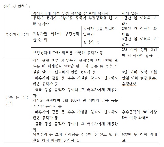 부정청탁금지법의 대상 직무 유형과 신고·처리 절차 등을 정리해 영등포시대 독자들에게 전한다. [편집자 주] ‘부정청탁 및 금품 등 수수의 금지에 관한법률’에서는 직무 관련성이 있을 경우 어떤 형태의 금품수수도 금지된다. 다만 원활한 직무수행, 사교, 의례, 부조 차원에서 우리 사회가 허용할 만한 최소한의 가액기증을 정해 예외 규정을 두었다. 예외 규정은 ‘부정청탁 및 금품 등 수수의 금지에 관한 법률’ 제 17조 관련 음식물(3만 원), 선물 5만 원, 경조사비 10만 원은 무방하다. ‘부정청탁 및 금품 등 수수의 금지에 관한 법률’은 누구든지 직접 또는 제삼자를 통하여 직무를 수행하는 공직자 등에게 아래 내용에 해당하는 부정청탁을 해서는 안 된다고 규정하고 있다. 부정청탁의 대상 직무와 유형을 들여다보면 ▲인가·허가·면허·특허·승인·검사·검정·시험·인증·확인 등의 처리에 관한 직무 ▲인가 또는 허가의 취소, 조세, 부담금, 과태료, 과징금, 이행 강제금, 범칙금, 징계 등에 관한 직무 ▲채용·승진·전보 등 공직자 등의 인사에 관한 직무 ▲각종 심의·의결·조정 위원회의 위원, 공공기관이 주관하는 시험·선발 위원 등에 관한 직무 ▲공공기관이 주관하는 각종 수상, 포상, 우수기관 선정 또는 우수자 선발 등에 관한 직무 ▲입찰·경매·개발·시험·특허·군사·과세 등에 관한 직무상 비밀에 관한 직무 ▲특정 개인·단체·법인이 계약의 당사자로 선정 또는 탈락하도록 하는 계약 관련 직무 ▲보조금·장려금·출연금·출자금·교부금·기금 등의 배정·지원, 투자·예치·대여·출연·출자에 관한 직무 ▲공공기관이 생산·공급·관리하는 재화 및 용역 등 거래 관련 직무 ▲각급 학교의 입학·성적·수행평가 등의 직무 ▲징병검사, 부대 배속, 보직 부여 등 병역 관련 직무 ▲공공기관이 실시하는 각종 평가·판정 관련 직무 ▲행정지도·단속·감사·조사 관련 직무 ▲사건의 수사·재판·심판·결정·조정·중재·화해 등의 직무는 부정청탁의 대상이다. 위와 같이 부정청탁의 대상이 되는 업무에 관하여 공직자 등이 법령에 따라 부여받은 지위·권한을 벗어나 행사하거나 권한에 속하지 아니한 사항을 행사하도록 하는 행위는 부정청탁 금지법 위반이며 부정청탁의 금지 및 금품 등의 수수 금지·제한 등에 관한 제도개선 및 교육·홍보계획의 수립과 시행, 공직자 등의 부정청탁 등 방지에 관한 업무의 총괄은 국민권익위원회가 한다. 위반행위를 신고하려면? 누구든지 이 법의 위반행위가 발생하였거나 발생하고 있다는 사실을 알게 된 경우에는 ▲이 법의 위반행위가 발생한 공공기관 또는 그 감독기관 ▲감사원 또는 수사기관 ▲국민권익위원회에 신고할 수 있다. 다만 신고하려는 자는 자신의 인적사항과 신고의 취지·이유·내용을 적고 서명한 문서와 함께 신고 대상 및 증거 등을 제출해야 한다. 신고하면 무조건 보상?, 처벌을 받을 수도 있다! 그렇지 않다. 신고의 내용이 거짓이라는 사실을 알았거나 알 수 있었음에도 신고한 경우, 신고와 관련하여 금품 등이나 근무 관계상의 특혜를 요구한 경우, 그 밖에 부정한 목적으로 신고한 경우에는 보상을 받을 수 없다. 그뿐만 아니라 타인에게 형사처분이나 징계처분을 받게 할 목적으로 객관적 진실에 반하는 허위사실을 신고하는 경우에는 무고죄로 처벌받을 수 있다.(형법 제156조) 신고 처리 및 이의신청과 국민권익위원회는? 국민권익위원회는 신고자를 상대로 사실관계 및 증거 유무 등의 신고 내용을 확인한 후 조사기관에 보내고 그 사실을 신고자에게 통지해야 한다. 신고를 받거나 국민권익위원회로부터 신고를 넘겨받은 경우에는 그 내용에 관하여 필요한 조사·감사 또는 수사를 하여야 하며 조사기관은 조사·감사 또는 수사를 마친 날부터 10일 이내에 그 결과를 신고자와 국민권익위원회에 통보 하고(국민권익위원회로부터 넘겨받은 경우만 해당한다), 조사·감사 또는 수사 결과에 따라 공소 제기, 과태료 부과 대상 위반행위의 통보, 징계 처분 등 필요한 조처를 해야 한다. 국민권익위원회는 조사기관으로부터 조사·감사 또는 수사 결과를 통보받은 경우에는 바로 신고자에게 조사·감사 또는 수사 결과를 알려야 한다. 조사·감사 또는 수사 결과를 통보받은 신고자는 조사기관과 국민권익위원회에 이의를 신청할 수 있다. 신고자 등의 보호·보상은? 누구든지 신고자에게 이를 취소하도록 강요하거나 불이익 조치를 해서는 안 되며 법을 위반한 자가 위반 사실을 자진하여 신고하면 위반행위에 대한 형사처분, 과태료 부과, 징계처분, 그 밖의 행정처분 등을 감경하거나 면제할 수 있다. 신고자의 보호에 관해서는 「공익신고자 보호법」 규정을 준용하고 ‘공익신고자 등’은 ‘신고자 등’으로, ‘공익신고 등’은 ‘신고 등’으로 본다. 신고로 인하여 공공기관에 재산상 이익을 가져오거나 손실을 방지한 경우 또는 공익의 증진을 가져온 경우에는 그 신고자에게 포상금을 지급한다. 신고에 따른 포상금·보상금 신청 및 지급에 관해서는 ‘부패방지와 국민권익위원회 설치와 운영에 관한 법률’의 규정을 준용한다.