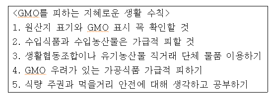 그동안 이 지면을 통해 여러 차례 알려드렸지만, 우리나라에 수입되고 있는 GMO는 일곱 가지이다. 콩과 옥수수, 유채, 면화, 사탕무, 알팔파, 감자이다. 이 일곱 가지 농산물만 수입 승인되어 있어서 다른 GM 농산물은 우리나라에 들어올 수 없다. 물론 엄격한 유통 관리를 통해 완전히 차단되고 있느냐는 문제는 다른 차원의 이야기지만 수입 승인된 것은 이 일곱 가지라는 것이다. 그런데 이 일곱 가지를 다 수입하고 있지는 않다. 올해 8월까지 우리나라에 수입된 GM농산물은 6백6십4만6천 톤인데 그중 옥수수가 5백7십7만9천 톤, 대두가 7십오만4천 톤이고 면실유가 십일만 3천 톤이다. 그 외에는 통계로 잡히지 않을 정도로 소량이 수입되고 있다(자료출처: 바이오 안전성 정보센터). 대표적인 GMO 중의 하나인 캐놀라유는 유채를 들여와 기름으로 가공하는 것이 아니고 기름을 짠 완제품을 기업이 수입해서 병 포장만 하는 것이라서 GMO 수입 통계에는 잡히지 않는다. 잡히지는 않으나 시판되고 있는 캐놀라유는 거의 GM 유채로 만든 것이라고 보면 된다. 우리나라가 수입하여 식품으로 판매하고 있는 GMO는 이 범위 안에 있다. 그런데 SNS에 유포되고 있는 정보 중에는 GMO 토마토와 non-GMO 토마토를 구별하는 방법을 소개하는 정보도 있다. 이는 우리나라에도 GMO 토마토가 유통되고 있으니 이를 구별하는 방법을 숙지하여 GMO 토마토를 가려먹기를 바란다는 의미를 내포하고 있다. 그런데 우리나라는 GMO 토마토가 수입 승인 품목이 아니라서 이를 수입해서 유통하는 것은 불법이다. 또 시중의 토마토케찹은 GMO 토마토를 사용할 가능성이 있으니 이를 피하려면 어디에서 파는 것을 사 먹으면 안전하다는 홍보물도 있다. 이 경우에도 마치 우리나라에 GMO토마토를 원료로 한 토마토케찹이 유통되고 있을 수도 있다는 오해를 전달할 수도 있다. GMO에 대해 걱정하고 거부해야 하지만 정확하지 않은 정보가 유통되면 혼란을 일어날 수도 있다. 해마다 10월 16일은 반 GMO의 날이다. 2010년 10월에 나고야에서 열린 '바이오 안전성에 대한 카르타헤나 의정서' 제5회 조약국회의(MOP5)에 참여했던 세계의 반GMO 시민 단체들이 매년 이날을 반GMO의 날로 정하자고 결의하면서 10월 16일을 반GMO의 날로 정하게 된 것이다. 이날은 UN이 정한 ‘세계 식량의 날’이기도 하고 또 국제주부연맹이 정한 ‘화학조미료 안먹는 날’이기도 하다. 우리나라도 2011년부터 해마다 이날을 반GMO의 날로 정해 기념하고 강연회나 토론회, 기자회견과 퍼레이드 등을 펼쳐 왔다. 또 ‘GMO 없는 밥상을 차리기 위한 생활 수칙’도 발표하여 이날 하루 만이라도 GMO없는 밥상을 차려보도록 안내하고 있다. 우리나라는 GMO표시제를 채택하고 있지만 단백질이 없거나 파괴되어 DNA 검사가 어려울 경우 그리고 수송이나 제조과정에서 GMO가 섞일 가능성이 있는 비의도적 혼입율이 3% 이하일 경우 GMO 표시를 하지 않아도 되도록 되어 있다. 그러니 GM 콩으로 만든 식용유나 GM 옥수수에서 추출한 올리고당, 과당, 시럽 등 많은 GMO를 원료로 한 제품이 유통되고 있어도 GMO로 만들었는지 확인하기 어렵다.그렇지만 반GMO의 날에 맞춰 발표하는 ‘GMO를 피하는 생활 수칙’을 지키기만 해도 GMO를 거의 피할 수 있다. 1. 원산지 표기와 GMO 표시 꼭 확인할 것 2. 수입식품과 수입농산물은 가급적 피할 것 3. 생활협동조합이나 유기농산물 직거래 단체 물품 이용하기 4. GMO 우려가 있는 가공식품 가급적 피하기 5. 식량 주권과 먹을거리 안전에 대해 생각하고 공부하기