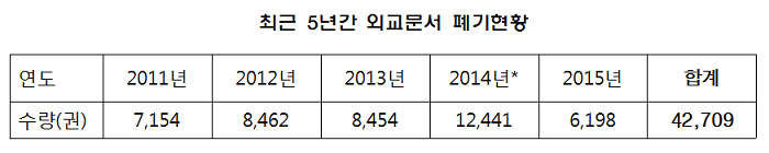 이의원은 “외교문서공개를 심사하는 심의위원 총 7명 중 외부 전문가는 외교부장관이 임명하는 단 1명이고, 차관인 위원장 포함 나머지 6명 모두 외교부 직원이다”고 지적하고 “결국 비밀을 생산한 외교부가 공개 여부도 스스로 결정하고 있다”라며 외교문서 공개 시스템에 대한 문제를 제기했다. 외교부의 외교문서는 문서 생산시 비밀문서와 일반문서로 크게 분류하는데 모든 문서는 활용 및 보호기간이 끝나면 일단 외교부 외교사료관으로 보내져 공개, 보존, 폐기 등의 절차를 밟고 있는 것으로 나타났다. 외교사료관에서는 30년 이상 경과되어 공개심의를 받게 되는 외교문서(비밀문서중심)이외에 기록보존기간이 10년 이하인 일반문서(비공개 포함)를 관련법에 의거 폐기하고 있으며 최근 5년간 외교사료관에서 관련법에 따라 폐기한 외교문서는 42,709권, 430만여 쪽에 달한다.