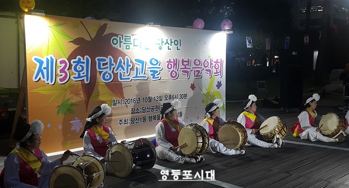 이날 열린 행복음악회는 당산1동 풍물놀이 동아리에 흥겨운 장구 소리에 이어 당산1동 주민인 지나정의 아코디언 연주, 배재두 당산1동 전 동장의 섹소폰 공연과 주민이 직접 참여하는 주민 장기자랑이 이어졌다.