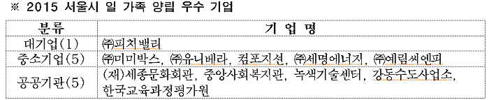 서울시여성가족재단(대표 강경희) 24일(월) 정오, 대방역 서울여성플라자 국제회의장 및 로비에서 일·가족양립, 관련 영화상영, 우수 기업·기관 시상 및 사례 발표, 토크 콘서트, 상담 부스 등을 선보일 예정이다. 우선 오후 4시부터 열리는 영화상영회에서는 직장인의 출산과 육아에 대한 문제를 회사 구성원 각자의 인터뷰로 보여주는 옴니버스 형태의 ‘가족 시네마’가 상영된다. 뒤를 이어, 2015년 서울시 일·가족양립 컨설팅 참여 기업 및 기관 중 우수 사례로 선정된 11개사에 대한 시상과, 대표적인 우수 사례 발표가 있을 예정이다. 일가족 양립 우수사례로 선정된 한 공공기관의 경우, 잘 갖춰진 기본적인 제도와 더불어 다양한 연령과 성별, 직무특성을 가지고 있는 근로자들을 위해 실제로 필요한 유연 근무 제도를 설계하고 실행하기 위해 소통했던 과정을 보여준다. 소규모 기업의 경우 업종 특성과 직원들의 지속가능한 근무환경을 만들어나가기 위해 다변화된 근로시간 제도를 정비하고 체계를 마련해나가며 작은 사업장, 디자인업종의 모델이 되는 사례를 이야기한다.