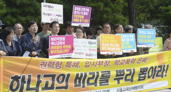 그러나 그는 하나고가 2011~2013년 지원자 103명에 대한 입학성적을 조작한 혐의로 서울시교육청 감사에서 적발되면서 교장 등 하나고 관계자들과 함께 검찰에 고발됐다. 김 이사장은 지난해 국정감사 당시 “법을 잘 몰랐다”라고 말했으나, 이후 이사회에 참석해 해당 내용을 숙지하고 있었음이 회의록을 통해 드러났고 위증죄로 고발해야 한다는 여론이 일었다. 하지만 지난 6월 서울서부지검은 <세계일보>와의 인터뷰에서 ”해당 사건을 수사한 경찰이 4월 1일 불기소 의견으로 검찰에 송치했기 때문에 마무리 수사를 진행 중이고 조만간 결론을 낼 것”이라고 밝힌 바 있다. 이후에도 감사처분사항을 이행하지 않는 등 하나고 사태가 해결되지 않자 오영훈 더불어민주당 의원실 등 야당에서 그를 국감 증인으로 신청했다. 하지만 새누리당이 미르·K스포츠재단 관련 증인 채택을 못 하게 하는 바람에 교문위에 신청된 증인이 전원 채택되지 않았다. 덩달아 김승유 이사장 국감 증인 채택도 무산됐다. 만약 그가 이번에 국감에 나왔으면 2014년 정무위, 2015년 교문위에 이어 3년 연속 국감 증인으로 채택되는 기록을 세울 뻔했다. 김승유 “후임은 하나금융지주이사회 의장직 역임했던 분” 김승유 이사장은 지난 10일 <머니투데이> 등과의 인터뷰에서 이사장직에서 물러나는 이유를“제 두 번째 임기가 끝나서 이사장직을 내려놓게 됐다”라고 밝혔다. 지난해 입시 비리가 불거지자 교육·시민단체들은 “하나고 부정행위 책임지고 김승유 이사장은 사퇴하라”라고 압박했다. 그 연장 선상에서 직에서 물러나는 것 아니냐는 이야기도 있었으나, 김 이사장은 이를 부인한 것으로 알려졌다. 그러나 서울시교육청 관계자는 “교육청이 더는 김승유 이사장의 (세 번째) 연임은 어렵다는 태도를 견지했다”라면서 “그것도 김 이사장이 물러나는 원인 중 하나로 작용했을 것”이라고 짚었다. 김 이사장의 후임은 김각영 전 검찰총장이 맡을 것으로 알려졌다. 김 이사장은 <머니투데이>를 통해 “제 자리를 대신할 분은 하나금융그룹 이사회 의장직을 역임하셨던 분”이라며 “이미 이사회를 거쳐 모든 절차가 끝났으며 서울시교육청의 인가만이 남았다”고 밝혔다. 김각영 전 검찰총장은 2002년부터 2003년까지 검찰총장을 역임했고, 이후 2010년 3월부터 2014년 3월까지 하나금융지주이사회 의장직을 역임했다. 신임 이사장은 오는 11월 이사회에서 선임될 예정이다. 현재 하나학원은 이태준 전 하나고 교장과 김각영 검찰총장 등 4명의 이사와 감사 1명에 대해 승인을 신청한 상태다. 서울시교육청 관계자는 “이태준 전 하나고 교장은 교육청이 감사결과 파면을 요구한 사람이고 (하나학원이) 교육청의 처분요구를 제대로 이행하지 않았다”면서 “어떻게 그런 사람을 이사로 승인하겠느냐? 반려할 것”이라고 밝혔다. 다만 김각영 전 검찰총장에 대해서는 “자세히 살펴보고 있으나 부적격 사유를 찾지 못하고 있다”라고 전했다. 김각영 전 검찰총장, 검찰 수사의 방패막이 역할? 하나고 설립 초기부터 관여했던 한 임원 관계자는 “신망받는 교육전문가들도 많은데 하필 검찰총장을 역임한 인사를 이사장으로 세우려는 의도가 순수해 보이지 않는다”라고 운을 뗐다. 그는 “2010년께 론스타 외환은행 인수건, 미래저축은행 부당지원 혐의 등이 터져 사회적 문제가 됐을 즈음에 김승유 회장에 대한 검찰 수사 등에서 당시 하나금융 이사회 의장이었던 김각영 전 검찰총장이 검찰 수사의 방패막이 역할을 했던 것으로 알고 있다. 이번에도 검찰수사에 영향을 끼치려는 의도 아니겠냐”라고 주장했다. 그는 또한 “김승유 이사장이 물러나더라도 그 영향력은 여전할 것이다. 새 이사들이 그와 가까운 사람들로 채워지기 때문”이라면서 “김 전 검찰총장과 유병택 이사는 하나금융 사외이사 출신이고, 권오남 교수는 하나고 3회 졸업생 학부모로 학교운영위원회 위원을 역임한 바 있다”라고 덧붙였다. 김득의 금융정의연대 대표는 “하나고는 작년 입시부정 등 여러 가지 범죄혐의에 대해 서울교육청 고발로 검찰 수사 중이다”라며 “지금 이 시기에 김승유 이사장이 물러나고 김각영 전 검찰총장이 하나고 이사장으로 온다면 검찰 수사 무마용이라는 세간의 의심을 피할 수 없다”라고 비판했다. 이어 “위기 때마다 김각영 전 검찰총장이 등장하고 교육과는 전혀 무관한 분이 학교 이사장으로 오는 게 너무 이상하다”라면서 “김승유 이사장의 호위무사인지 아니면 하나고 수사를 잘 방어할 구원투수인지 모르겠지만, 우연의 일치가 반복되고 있다”라고 덧붙였다. 서울시의회 하나고 특위 이정훈 위원장은 “단계적으로 임직원 전형폐지를 결정한 현시기에 전직 검찰총장을 학교법인 하나학원 이사장으로 임명하는 이유가 마땅치 않다”라면서 “마치 입시 비리 등 여러 혐의로 고발되어 수사 중인 김승유 이사장에게 검찰의 힘을 이용하여 또 다른 면죄부를 주려는 의도가 아닌지 의심된다”라고 비판했다. 한편, 서울시의회와 서울시교육청은 지난해 9월 하나고를 감사한 결과 신입생 입학 전형 부정운영 등 7건의 혐의를 
