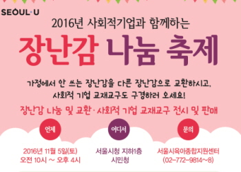 서울시와 서울시육아종합지원센터 11월 5일(토) 신청사 지하 1층 시민청에서 오전 10시부터 오후 4시까지 영·유아 자녀가 가지고 놀다가 싫증난 장난감을 교환할 수 있는 장난감 나눔축제가 열린다.