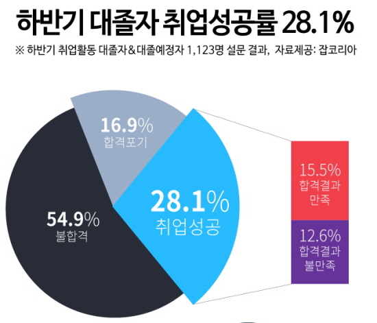올 하반기 취업활동에 나선 대졸자 및 대졸 예정자 중 45.1%가 합격통보를 받았지만, 합격통보에 만족하지 못한 16.9%가 취업을 거절했으며 28.2%만이 출근을 결정한 것으로 나타났다.