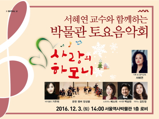 12월 3일 (토) 오후 2시에 서울역사박물관 1층 로비에서 「서혜연 교수와 함께하는 박물관토요음악회」가 개최된다.