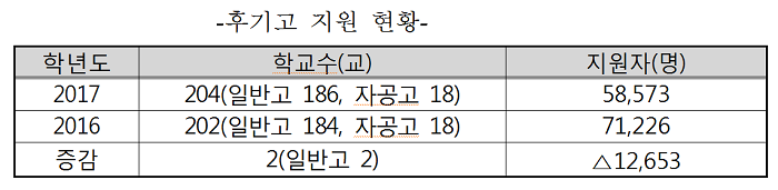서울시교육청에 따르면 이번 ‘2017학년도 후기고등학교’의 지원자는 2016학년도 지원자보다 12,653명이 감소한 58,573명이다. 이는 저출산에 따른 학생 수 감소 영향으로 분석된다.