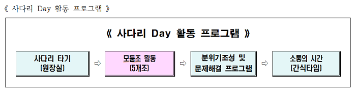 ‘사다리 Day’ 프로그램 운영, 소통·협력·어울림의 조직문화 조성 다양한 구성원들의 업무 협업을 통한 조직 내 의사소통의 중요성 인지, 건전하고 타인을 배려하는 조직문화 안착으로 행정의 능률성·효율성·창의성을 촉진하여 함께 가면 멀리 가는 직장분위기 조성을 위한 사다리 Day가 올해도 지속해서 추진된다. 서울학생교육원 (원장 신명철)은 직원 상호 간 업무 이해도를 높이고 행정의 능률성· 효율성·창의성을 촉진하는 조직문화 조성을 위해 ‘사다리 Day’라는 소통의 장을 작년에 이어 올해에도 지속해서 추진한다. 특히, 사다리 Day 행사 프로그램 중 ‘분위기 조성 및 문제해결 프로그램’ 모험(adventure) 기반의 실내 집단 활동을 서울시교육청 산하기관에 파급시키는 등 어울림 조직문화의 확산에 기여하고 있다.