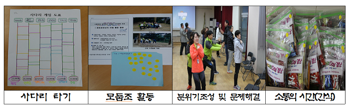 ‘사다리 타기’는 기관장을 포함한 모든 직원을 6개 내외의 조로 구분하고, 사다리를 이용해 조별 역할을 정하는 놀이문화로 상·하 지위 구분 없는 공정한 행정 기반 조성에 도움을 주며, ‘모둠조 활동’은 부서장 등 간부를 조장으로 여러 직렬을 고르게 섞어 모둠을 편성(2개월 단위)하여 미션을 수행하는 활동으로 직원 간 친밀도를 제고시키는 것으로 평가되고 있다. 또한 ‘분위기조성 및 문제해결 프로그램’은 월별로 소통 주제 소통과 공감, 양심과 청렴, 나눔과 사랑, 친절과 배려, 이해와 존중, 신뢰와 협력, 정직과 정의, 성실과 책임을 정하여 열린 공간에서 모든 직원이 함께 모여 신체활동을 하며, 이를 통하여 조직 분위기를 밝게 하는 동시에 함께 문제를 해결하는 과정에서 협업의 중요성을 인식시키는 데 기여하고 있다. ‘소통의 시간’은 사다리 타기로 마련된 비용으로 음식 조달 조가 음식을 배달해주면 각 실에서 간식을 먹으며 직원 간 상호 소통하며 화합을 다지는 시간을 갖는 활동이다.