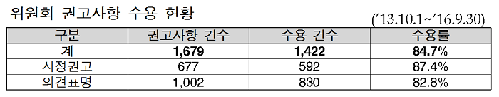 권고 수용률 95% 이상 우수 기관은 국가보훈처(100%), 경기 고양시(100%), 국민연금공단(100%) 등 7개 기관이며 80% 미만은 경기 성남시(50.0%), 한국농어촌공사(66.7%), 근로복지공단(67.3%) 등 8개 기관이다.
