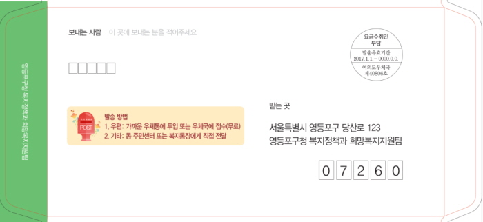 영등포구는 이러한 문제점을 보완하기 위해 회송용 우편봉투 및 도움 신청안내문을 제작하여 1월 초 각 동으로 배부하였다. 배부된 안내문은 ▲복지플래너 ▲우리동네주무관 ▲복지통장이 각 동의 지하, 옥탑방, 고시원 등 거주환경 취약가구에 중점적으로 전달할 예정이며 현재 각 동으로 안내문 총 16,000부가 배부됐다.