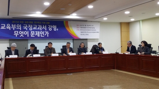 12일에는 국회에서 '교육부의 국정교과서 강행 무엇이 문제인가'를 주제로 긴급토론회를 열었다. 국정화저지넷과 야3당이 공동주최한 이 날 토론회에선 ▲역사교과서 국정‧검정 혼용 방침의 문제점 ▲ 역사과 교육과정과 편찬기준의 문제점 및 바람직한 교과서 개발 일정 ▲ 교육부의 검정 절차 강화 및 연구학교 지정 운영 등에 대한 전문가의 견해와 의견을 청취했다. 국정화저지넷 한상권 대표(덕성여대 교수)는 “교육부의 국‧검정 혼용방침은 국정교과서를 철회한 것처럼 보이지만, 실제로는 철회를 가장한 사실상 강행으로, 정부가 국민을 상대로 엄청난 사기극을 벌인 것” 라고 직격탄을 날렸다. 또한 “검정교과서 집필과 심의과정은 최소 1년 6개월에서 2년 소요되는데, 교육부가 이를 1년으로 단축하겠다고 하는 것은 결국 부실 검정교과서를 만들겠다는 것”이라며 비판했다. 김육훈 역사교육연구소장은 “신청하면 모두 연구학교로 지정하여 국정교과서를 사용하도록 하겠다는 방침은 학생의 부담 등 학교현장의 어려움을 아랑곳하지 않고 어떻게든 국정교과서를 보급하려는 발상”이라고 말문을 연 뒤, "2015교육과정과 편찬기준을 바꾸지 않고 검정교과서조차 국정교과서처럼 만들겠다는 의도가 반영된 것"이라고 성토했다. 그는 아울러 "2015 교육과정 개정, 편찬기준 폐기를 전제로 새로운 검정교과서 개발이 논의돼야 한다"고 덧붙였다. 더민주당 역사교과서국정화저지특위 위원장 유은혜 의원은 “교육부의 국‧검정 혼용과 연구학교 지정 강행은 국정교과서를 강행하겠다는 것”이라며 “학교현장의 혼란을 없애겠다는 교육부는 오히려 갈등과 혼란만 가중시키고 있으며 이 문제 해결을 위해선 국정교과서 폐기만이 답이다”라고 주장했다. 국회 교문위 유성엽 위원장(국민의당)은 “교육부가 ‘특정감사 운운’, ‘연구학교 지원금 증액’ 등을 통해 연구학교 지정, 즉 국정교과서 시범시행을 강요하고 있어서 문제를 낳고 있다”고 비판했다. 이어 “지난 1월 5일 장시호 씨가 특검에 제시한 테블릿PC를 분석한 결과 2015년 10월 13일 수석비서관회의의 박근혜 대통령 말씀 자료는 최순실이 수정한 것으로 드러났다고 특검이 발표했다”며 “이 국정 역사교과서는 최순실 국정 역사교과서라는 것이 다시 한 번 드러났다”고 말했다. 박원순 서울시장도 “국정교과서 무조건 폐기돼야!” 박원순 서울시장도 국회에서 열린 교육감 초청 교육개혁토론회에서 “역사학계는 물론 국민 대부분이 반대하지만 교육부가 역사교과서 국정화를 강행해 온 나라를 혼란에 빠트렸다”며 “평가와 예산지원을 앞세워 전국의 학교와 선생님들을 줄 세우며 통제하고 있다”고 날을 세웠다. 박 시장은 지난해 11월 29일에도 사회관계망서비스(SNS)에 “국정교과서는 무조건 폐기돼야 한다, 발상 자체가 독재적이다. 국가가 국민의 역사의식을 통제하겠다는 것”이라며 “특히 박근혜 정권이 국민 대다수가 반대하는 역사교과서의 국정화를 밀어붙인 것은 친일파와 박정희 정권을 미화하기 위한 것”이라는 비판 태도를 보인바 있다.