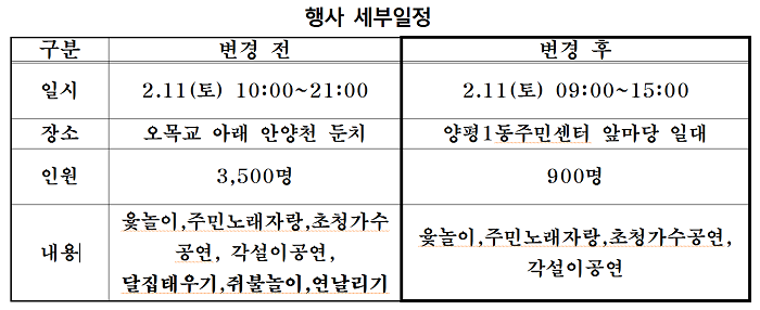 대신 장소를 양평1동주민센터 앞마당 일대로 옮기고 오전 9시부터 오후 3시까지 윷놀이, 주민노래자랑, 초청 가수공연, 각설이공연 등은 예정대로 진행한다.