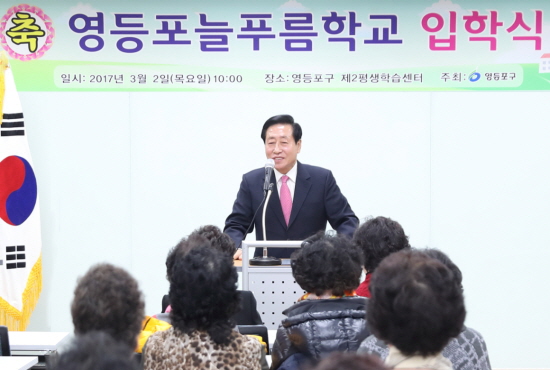 2017년 영등포 늘푸름학교 신입생 입학식이 2일 오전 구청 별관 제2평생학습센터에서 열렸다. 영등포 늘푸름학교는 배움의 때를 놓친 어르신들이 별도의 검정고시를 거치지 않고도 초등학력을 인정받을 수 있는 성인문해 교육기관이다. 이날 열린 입학식에 참석한 이용주 영등포구의회 의장은 만학도의 길을 걷는 어르신들에게 격려와 함께 “교육 잘 이수해 배우는 즐거움과 함께 삶의 자신감을 찾는 계기가 되기 바란다”고 했다.