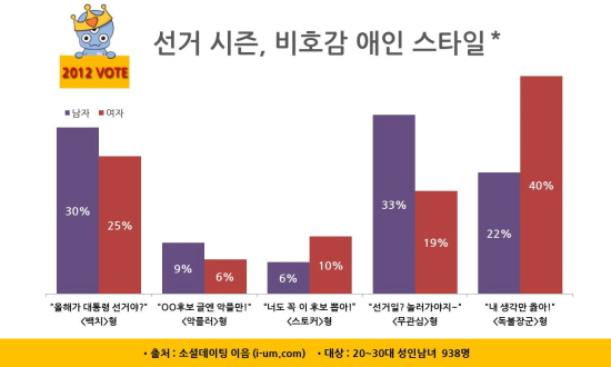 No.1 소개팅 서비스 이음(www.i-um.com, 대표 박희은)은 제 18대 대통령선거를 앞두고 20~30대 성인남녀 938명을 대상으로 ‘정치와 연애’를 주제로 한 설문조사를 실시했다. 그 결과 남성 응답자는 ‘투표보다 휴일부터 챙기는 ‘무관심’형 여자친구(33%, 196명)’를, 여성 응답자는 ‘본인의 정치 의견만 내세우는 ‘독불장군’형 남자친구(40%, 133명)’를 각각 ‘선거 시즌, 비호감 애인 스타일’ 1위로 선정했다.