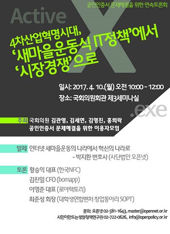 10일(월) 오전 10시30분 국회의원회관 제3세미나실에서 ‘새마을운동식 IT정책에서 시장경쟁으로'라는 주제로 공인인증서 문제해결을 위한 연속토론회가 ‘공인인증서 문제해결을 위한 이용자모임’(이하 이용자모임) 주최로 열린다. 각 정당 대선후보에게 ‘공인인증서 문제해결을 위한 공개질의서’를 전달한 바 있는 이용자모임이 개최하는 이번 토론회에서 회신 내용은 종합해 이번 토론회 중 발표할 예정이다. 이날 토론회는 이용자모임을 주도적으로 결성한 (사)오픈넷과 (사)시민이만드는생활정책연구원(이하 생활정책연구원)이 주관하며 국회의원 김세연(바른정당), 김관영(국민의당), 김영진(더불어민주당), 홍의락(무소속) 의원이 공동 주최한다. 이용자모임은 2월 27일 공인인증서 문제해결을 위한 1차 정책토론회를 개최했다. 이후 문재인 더불어민주당 대선후보는 시장자율화 원칙에 따라 국가주도의 ‘공인’인증수단 규제를 폐지하겠다고 밝힌 바 있다. 최근 우리나라 첫번째 인터넷 은행이 영업을 개시해 폭발적인 반응을 얻고 있으나 공인인증서의 벽에 부딪힌 많은 이용자들이 불편을 호소하고 있다. 이용자모임은 수많은 인터넷이용자들이 불편해하는 공인인증서가 광범위하게 사용되고 있는 원인을 이른바 ‘새마을운동’ 방식의 IT 규제와 이로 인한 시장경쟁의 실종에 두고 있다. 이번 2차 토론회는 황인국 생활정책연구원 공동대표의 인사말을 시작으로 촘촘한 규제하에서도 새로운 해결책 제시를 위해 노력해 온 스타트업 기업 및 대학생 벤처 창업 동아리 대표가 토론패널로 참석하여 시장경쟁 촉진을 위한 구체적인 규제개선 방안을 도출할 예정이다. 이번 토론회에서는 (사)오픈넷 박지환 변호사의 발제 이후 참석 국회의원이 직접 인터넷 3D 규제를 체험하는 시연회가 진행된다. 이후 체험 소감 발표와 함께 참석 국회의원과 이용자모임 간 정책협약식이 진행된다. 이번 토론회는 IT기술의 발전과 4차산업혁명 대비를 위한 현실적인 대안을 제시하고 문제를 해결하기 위해 적극적으로 노력하는 계기가 될 것으로 기대된다.