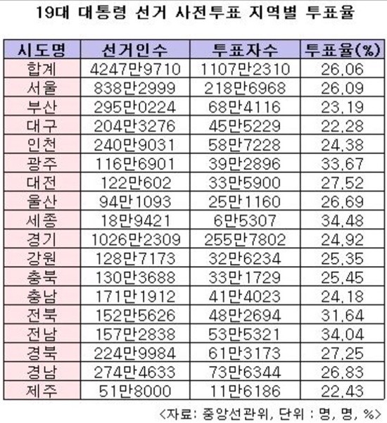 중앙선거관리위원회는 4일 오전 6시부터 이날 오후 6시까지 진행된 제19대 대선 사전투표에서 총선거인 4천247만9천710명 중 1천107만2천310명이 투표에 참여했다고 5일 오후 밝혔다.