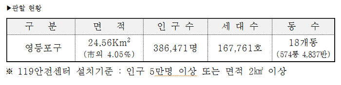 영등포소방서는 3과 1단(진압대․구조대) 4안전센터로, 올해 5월 현재 소방공무원은 276명, 소방차량 39대와 통신장비 469대를 운영하고 있다.