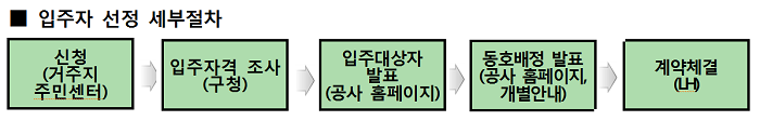 예비입주자는 9월 8일(금) 선정․발표할 예정이며, 예비입주자로 선정되면 기존대기자가 우선 입주한 후, 모집 순번에 따라 입주가 가능하다. 공급신청은 거주지 동 주민센터에서 신청자 적격 확인를 위해 현장접수만 가능하며, 기타 자세한 사항은 SH공사 홈페이지(www.i-sh.co.kr)나 LH공사 홈페이지(www.lh.or.kr) 공고문(‘17.5.31)을 참고하면 된다.
