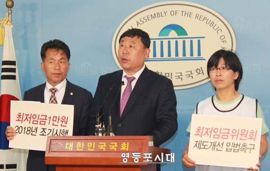하나의 진보, 세상을 바꾸는 정치 민중의 꿈과 윤종오, 김종훈 국회의원(아래 일동)은 1일 오후 국회 정론관에서 기자회견을 열고 ‘2018년 최저임금 시급1만원과 최저임금위원회 개선을 위해 모든 국회의원의 동참을 촉구했다.
