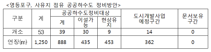 위 용역 결과에 따르면 영등포구 사유지 통과 공공하수관로는 총 53개소 약 1.25km이며 그중 수리적 안정성, 이설 가능성, 주위여건 등을 종합적으로 검토하여 이설 가능구간 30개소 약 435m를 선정하였고, 지형여건, 대체 공공부지 부재 등으로 당장에 이설이 불가능한 구간(현상유지) 약 453m에 대해서는 장기적인 이설방안을 마련할 계획이다. 또한, 그 외, 도시개발사업 예정구간 14개소 약 362m에 대해서는 재개발, 재건축 등과 연계하여 정비할 예정이다.