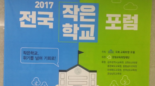 점점 사라져 가는 농·산·어촌의 작은 학교를 살리기 위한 '2017 전국 작은 학교 포럼'이 지난 7일 국회 의원회관 대회의실에서 '작은 학교, 위기를 넘어 기회로'라는 주제로 성황리에 열렸다. 이 행사는 국회 교육희망포럼과 강원교육희망재단이 주관했고, 강원·광주·충북·충남·전북·전남·경남 등 7개 교육청이 후원하는 형식으로 개최됐다.