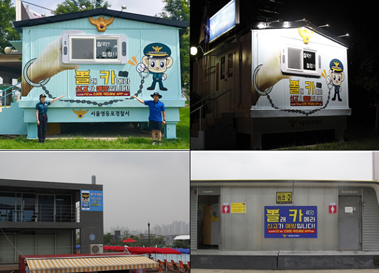서울 영등포경찰서(서장 조병노)는 7월 24(월) 영등포구 여의도 한강공원에 위치한 여의도 여름파출소 6월 30일부터 8월 31일 외벽에 몰카 등 성범죄 범죄 예방을 위한 이색조형물을 설치하고 여의도 한강수영장 등 이용객이 많은 시설에 몰카 범죄 예방 대형 홍보 포스터(2.4m X 1.5m)를 붙였다. 여의도 한강공원은 서울시 한강공원 중 가장 많은 시민이 이용하는 곳으로서 조형물 설치장소로 선정해 시민들에게 몰카 촬영이 범죄라는 점을 인식시키고, 긴급 신고번호 ‘112’ 뿐만 아니라 ‘스마트 국민제보 앱’으로도 몰카범을 신고할 수 있다는 점을 널리 알리기 위해 기획설치 했다. 여름파출소 외벽은 ‘몰래카메라 신고가 예방입니다’라는 문구와 함께 몰카범을 포돌이가 검거하는 모습을 형상화하여 몰카범은 반드시 경찰에 검거된다는 메시지를 담았다. 서울 영등포경찰서 관계자는 “앞으로 몰카 등 성범죄 예방 현장캠페인을 지속해서 전개하여 즐겁고 안전한 휴가 만들기에 최선을 다할 예정이다”고 전했다. 「성폭력범죄의 처벌 등에 관한 특례법」 제14조(카메라 등을 이용한 촬영) → 5년 이하의 징역 또는 1천만원 이하의 벌금 처에 진다.