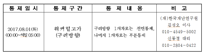 8월1일(화) 00:00~05:00 사이 워커힐고가 구리방향의 부분 교통통제가 이루어진다.