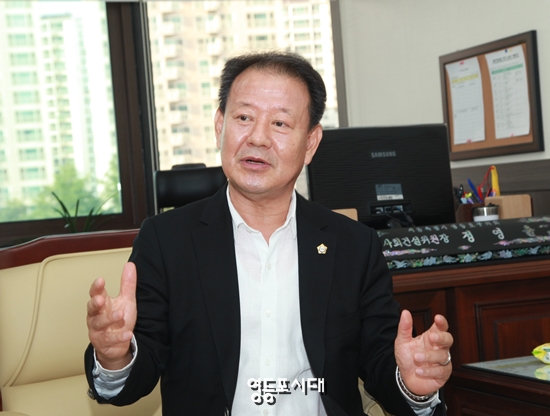 문재인 정부에서 추진하는 특목고 및 자사고 폐지와 방향이 맞지 않는다는 점과 부지 및 예산 문제로 현실적으로 이루어지기 힘든 것 아니냐는 지적에는 “예를 들면 부지는 여의도 모 병원 옆에 사용하지 않고 있는 5천여 평의 나대지가 있다”고 밝히고 “의지만 있으면 부지나 예산 등은 시간이 걸리겠지만 해결할 수 있을 것이다”고 강조했다. 정 위원장은 “영등포구 인구가 줄고 있다는 것은 모두가 다 알고 있는 사실이다”고 덧붙이고 인구가 줄어드는 이유에 대해서는 “여당은 뉴타운, 야당은 교육이 낙후되어서 그렇다고 주장하고 있다”면서 “실제로 교육문제를 해결하기 위해 목동이나 강남으로 이사하는 경우가 있다”고 주장했다. “여의도 윤중중학교의 경우 신길동과 마포구에서 통학하는 학생이 70% 정도이고 여의도 학생은 30% 정도에 머물고 있다는 점을 잘 알고 있다”고 복잡한 속내를 드러낸 정영출 위원장은 “구 집행부와 특별한 갈등은 없었다”고 밝혔다. 사회건설위원회 후반기 1년 동안의 평가에 대해 “공부하는 위원회, 현장 방문을 통해 대안을 제시하며 주민의 곁으로 한 발짝 더 다가간 의정활동이었다”고 자평했다. “사회건설위원장으로서 여·야 의원들과의 소통방식에 대해 ”맨투맨 방식으로 격의 없이 소통한다”고 밝힌 정영출 위원장은 구 집행부와 민원인 간의 갈등은 건축 분야에서 안전과 불법, 허가 문제에서 발생하는 것 같다”며 “효율적이고 빠른 해결을 위한다면 구청과 구의회에 한꺼번에 민원을 제기하는 것도 한 방법이다”고 귀띔했다.