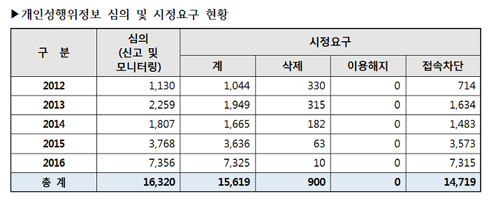 ‘개인성행위정보 심의 및 시정요구’ 건수가 매년 증가한 것으로 나타났다.