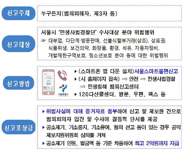 서울시 민생사법경찰단(이하 ‘민사단’) 불법 다단계 및 대부업, 식품, 보건, 환경 등 12개 수사 분야에 대한 결정적 증거와 함께 범죄행위를 신고‧제보하여 공익증진을 가져 올 경우「서울특별시 공익제보 보호 및 지원에 관한 조례」에 따라 최대 2억 원까지 포상금을 지급하고 있다. 신고포상금 지급 여부와 지급 액수는 범죄사실에 관한 구체적 내용 및 범죄혐의에 대한 증거 제출 여부 등 신고내용과 범죄규모, 신고‧제보 사항에 대한 수사로 공소제기 된 피의자 수 등을 종합적으로 고려하여 서울시 공익제보 지원위원회에서 공정한 심의를 거쳐 결정한다.