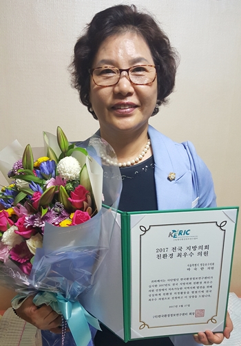 영등포구의회 마숙란 의원(오른쪽 사진)이 27일(수) (사)한국환경정보연구센터가 선정한 2017 전국지방의회 친환경 최우수 의원으로 선정되는 영광을 안았다.