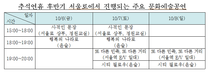 서울로는 걷기 좋은 가을을 맞아 꽃과 열매가 가득한 상황이다. 현재 서울로 상부에서 열매를 관찰할 수 있는 식물은 구기자나무, 꽃사과, 낙상홍, 미국낙상홍, 남천, 대추나무, 은행나무, 산사나무, 마가목, 해당화, 산딸나무, 좀작살나무, 흰작살나무, 자귀나무, 팥배나무, 모과나무, 회화나무, 백송, 소나무 등 20여종이다. 추석연휴 동안에도 평균 낮기온이 20~23도 정도로 시원한 가을날씨가 지속될 것으로 예보되고 있어 많은 방문객에 대비해 다양한 문화프로그램도 준비되어 있다. 상설 전시로는 서울로 전시관에 네이버문화재단에서 ‘헬로!아티스트’ 전시로 기획한 정혜련 작가의 설치미술작품 ‘예상의 경계(A line of the projection)’가 상설 전시중이다. LED 조형물에 다양한 색상의 조명이 변화무쌍하게 변신하는 작품으로 야간 나들이시 더욱 감동을 주는 작품이다. 서울로에서 진행되는 예술공연은 ‘서울거리예술축제2017’ 초청공연(10월6일~7일) 3작품과 만리동광장내 설치된 설치미술작품인 ‘윤슬’ 내부에 스톤필로우(돌처럼 보이는 쿠션)을 배치하고 그 속에서 진행되는 명상, 독서, 요가가 복합된 참여형 명상프로그램인 ‘City Pillow’(10월7일~8일)가 눈에 뜬다. 추석연휴 후반기 서울로에서 진행되는 주요 문화예술공연 도표 2 서울시 이수연 서울로운영단장은 “단기간내 5백만명이 방문해 주신 것에 안주할 것이 아니라, 방문하신 분들이 재차 방문하시고 SNS 등을 통해 전파해 주실 수 있도록, 시설개선, 안전관리에 최선을 다하는 한편으로 가을에는 도보투어, 겨울에는 조명과 얼음을 활용한 다양한 콘텐츠를 지속적으로 준비하겠다”고 밝혔다.