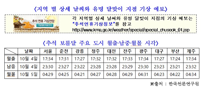 10월 3일(화)~4일(수)까지는 고기압의 가장자리에서 전국이 대체로 흐리거나 구름이 많을 것으로 예상한다. 또한, 추석 당일(4일)에는 중부지방과 전라북도는 상층(5km 이상)의 두꺼운 구름 사이로 달을 볼 수 있겠으나, 그 밖의 지역에서는 달을 보기 어려울 것으로 보인다.