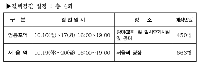 서울시는 취약한 주거환경과 면역력 저하로 결핵 발생 우려가 높은 거리노숙인 및 쪽방 주민 등을 대상으로 상반기 4월 에 이어 하반기 10월 결핵검진은 거리노숙인 및 일시보호시설의 노숙인을 대상으로 하며, 쪽방 주민은 희망자에 한해 실시한다.