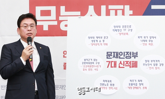김광림 정책위의장(오른쪽 사진)은 “문재인 정부의 7대 신적폐 중에서도 인사가 만사라는 말이 있듯이 문재인 정부의 신적폐 근본 원인은 결국 인사에 있다고 생각한다”며 “19명 국무위원 중에서 18사람이 시민단체, 대선캠프, 노동운동가 이 출신으로 국무위원이 채워졌다”고 비판했다.
