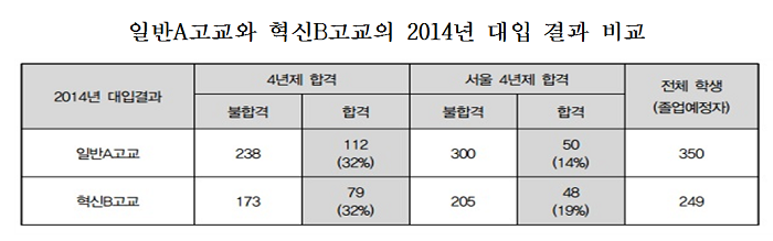 이와 별도로 서울특별시교육청에서는 2015년에 학업성취도 평균 및 가계 소득 수준이 비슷한 혁신고와 일반고를 비교한 결과, 입학 당시 성적 대비 학업성취도 성적에서 혁신고가 일반고보다 더 나은 결과를 보여줬다는 자료를 제시한 바 있다.