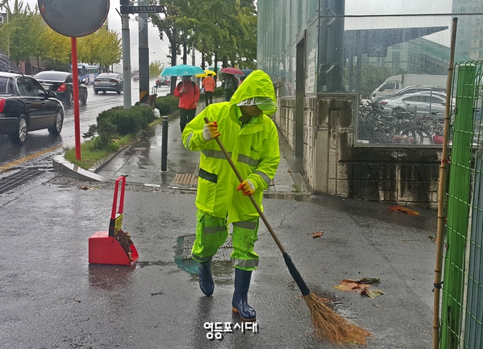 11일(토) 오전 영등포구 신길역 근처에서 우비를 입은 영등포구 공무관(환경미화원)이 길거리에 떨어진 낙엽을 쓸고 있다. 우산을 쓰고 출근길에 오른 시민들이 뒤로 보인다.
