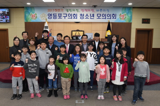 ‘2017년 하반기 청소년 모의의회’는 9일 오후 4시 선유지역아동센터 학생과 관계자 27명과 10일 오전 10시 영신초등학교(신길1동) 5학년 학생 23명이 영등포구 본회의장을 찾아 의장, 구의원, 의회사무국장 등으로 역할을 나누어 실제 회의 진행방식과 같게 회의를 진행했다. 개회식, 사무국장 보고, 제안 설명, 찬·반 토론, 표결과 의결 등의 순서로 모의회의를 진행한 학생들은 자신들이 직접 정한 교내 문제 등에 대해 안건을 상정하고 토론을 벌였다. 이날 학생들이 모의회의에 상정한 안건은 ▲건전한 이성 친구를 사귀기 위한 결의안 ▲교내 휴대폰 소지 및 사용금지에 관한 조례안 등이다. 이용주 의장과 고기판 부의장은 “영등포구를 이끌어 갈 학생들이 성숙한 민주시민으로 성장할 수 있도록 체험 프로그램 강화”, “의회 체험을 통해 지방의회의 의미와 역할”을 강조하고 “교육 환경 개선을 통해 명품교육도시 건설과 학생들이 꿈을 키워갈 수 있도록 지원하겠다”고 말했다. 그동안 구민의 곁으로 한발 더 나아가기 위해 구의회 문턱을 낮추기 위해 회의실을 개방하는 등 노력을 기울여온 영등포구의회는 2013년부터 매년 2회 청소년 모의의회를 운영해오고 있다.