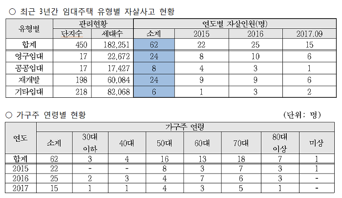 3년간 임대주택 자살사고는 총 62건 최근 3년간 임대주택 자살사고는 총 62건(`17년 9월 기준)으로 집계된 가운데 임대주택 입주민의 자살과 고독사에 대한 서울주택도시공사의 관심과 대책이 필요하다는 지적이 나왔다.